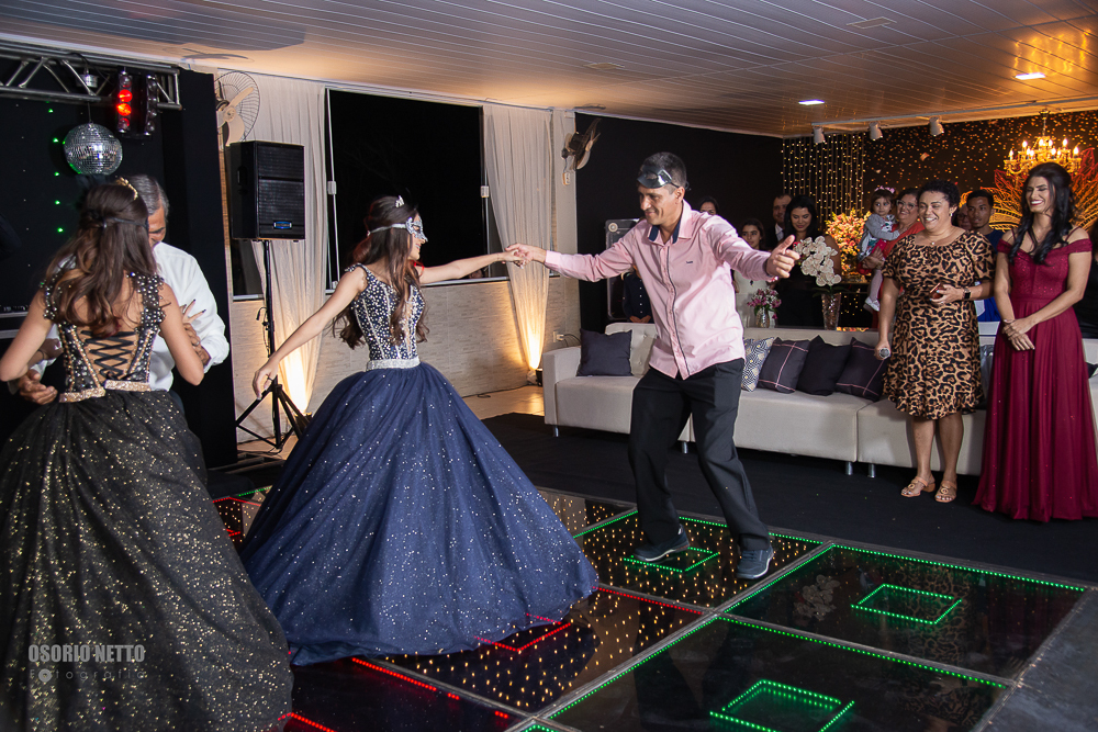 Duas adolescentes cheias de energia, que proporcionaram momentos maravilhosos, desde a chegada ao Cerimonial Espaço Aliança até o fim da festa, marcada pelas fotos com familiares, lindas fotos posadas na mesa de decoração, e fechando com chave de ouro a dança com o pai na pista, com o DJ animando toda festa.
