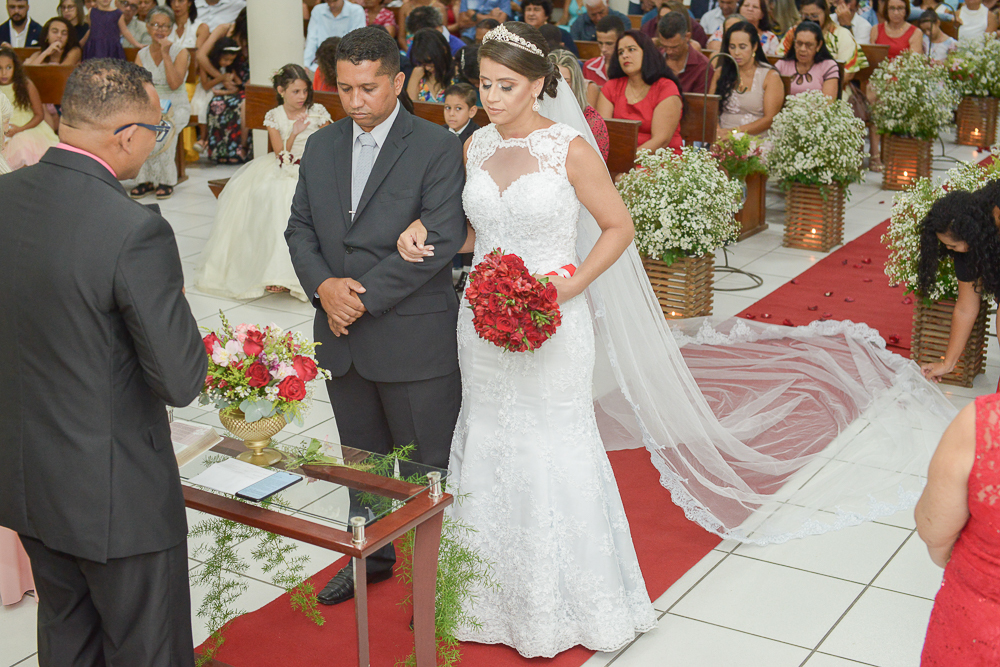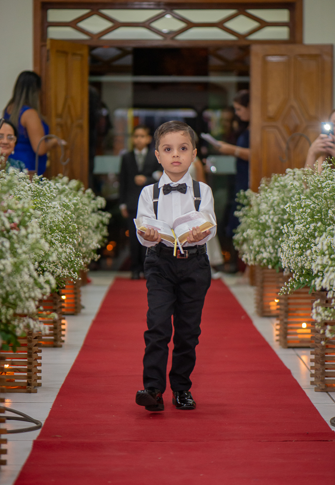 Marcado por um ensaio externo lindo realizado previamente, chegou o grande dia do evento, a Igreja Batista de Cariacica Sede lindamente decorada para este evento mais que especial, com o corredor de entrada em uma linda decoração de flores.