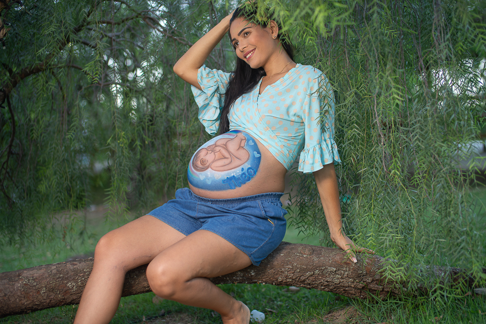 Começando pela perfeita maquiagem, que não pode faltar para uma ótima qualidade do ensaio, foi desenhado na barriga da mamãe a imagen do Theo, o príncipe a caminho.